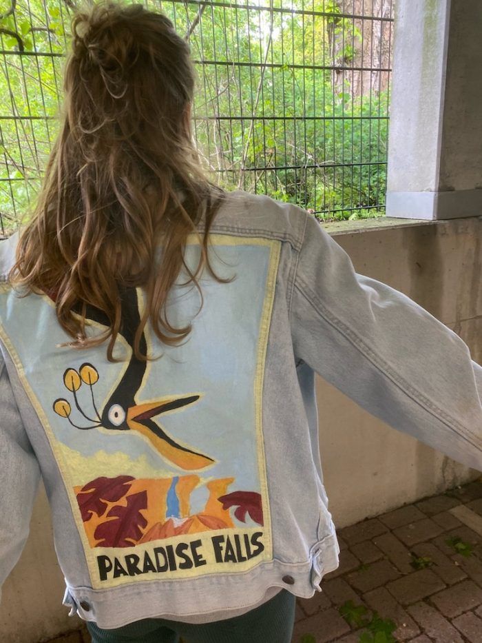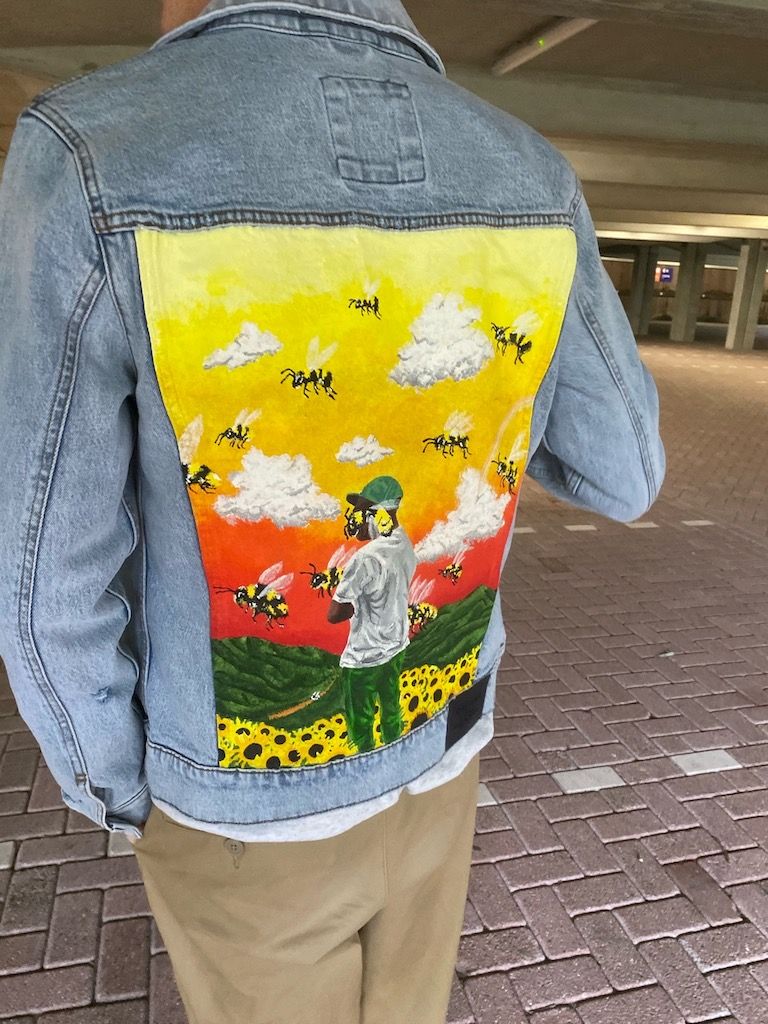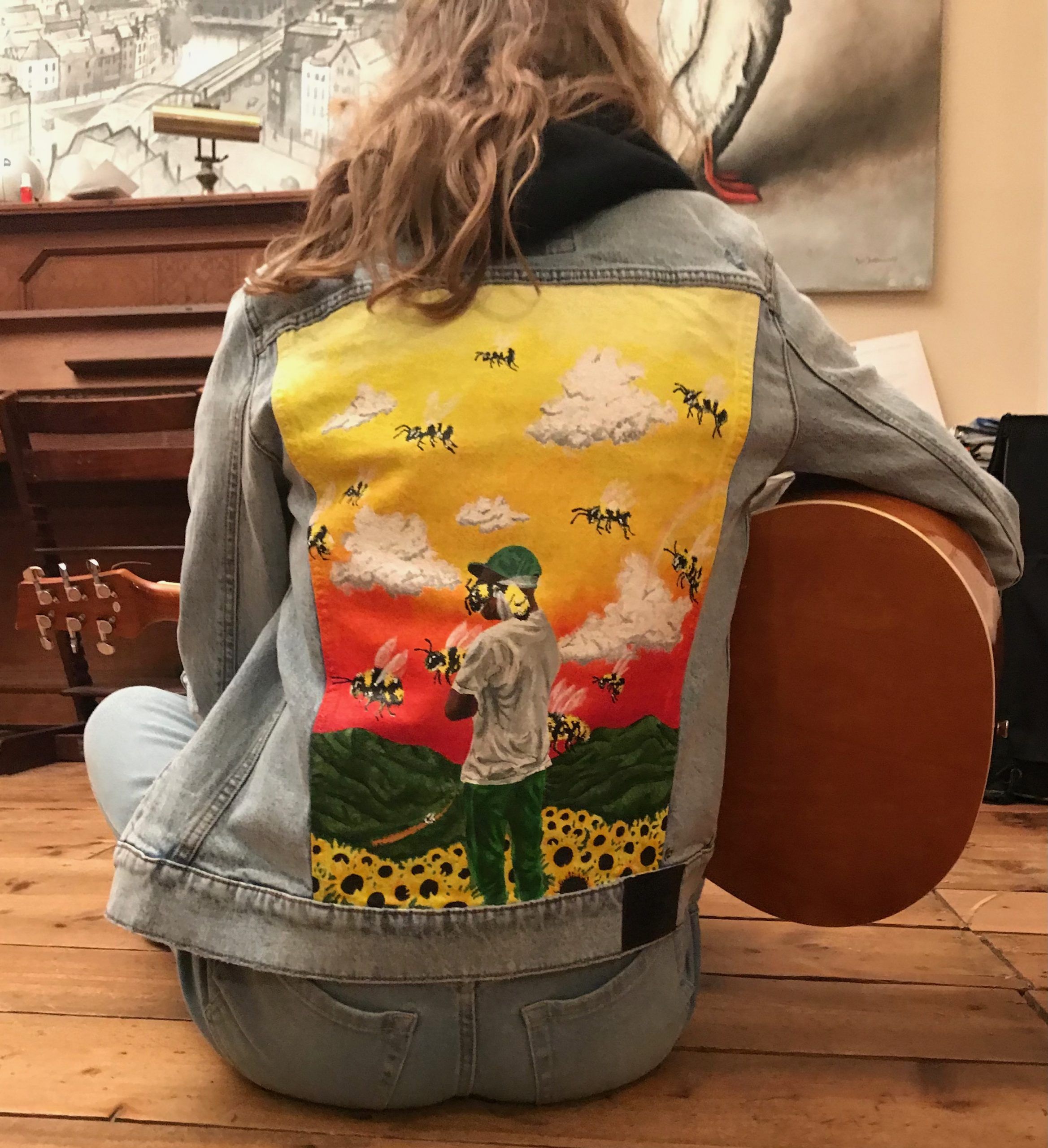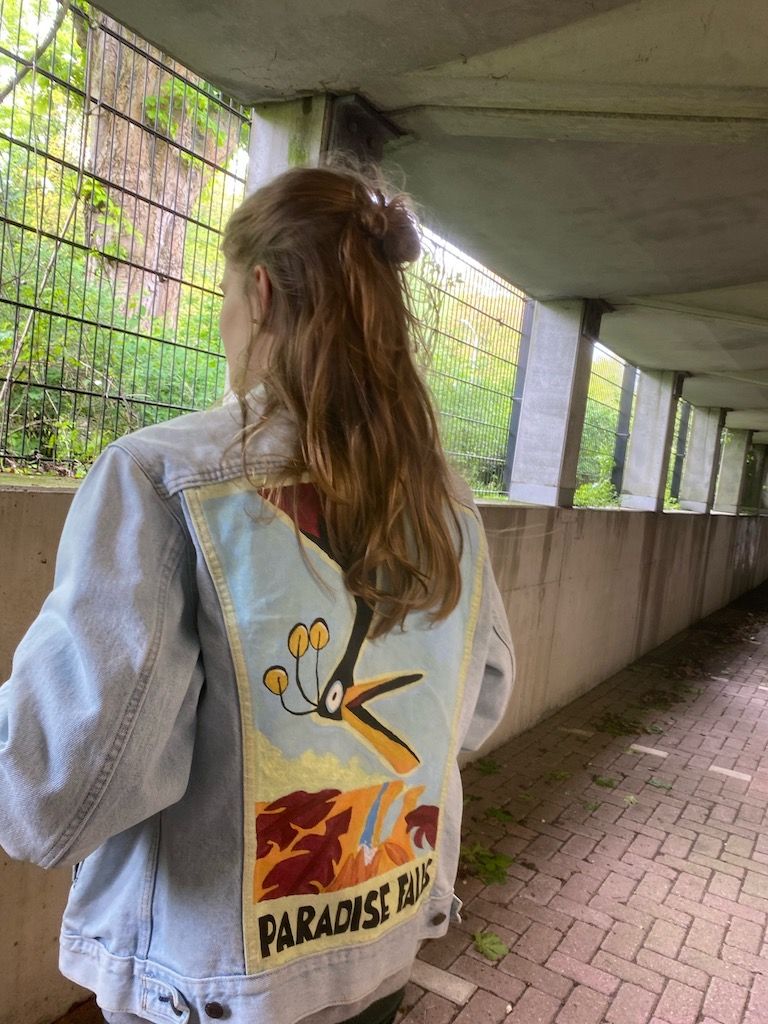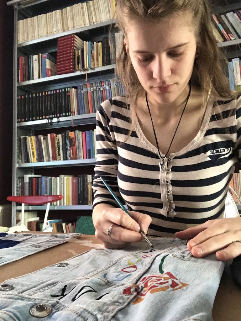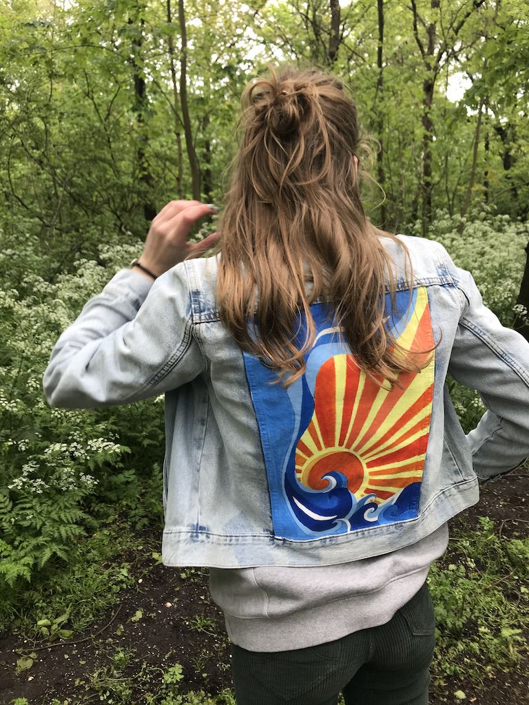 Zodra we het eens zijn over het ontwerp en de prijs kan je je jacket opsturen zodat ik aan de slag kan. Ik start met een witten grondlaag. Als de grondlaag droog is begin ik met het ontwerp er op te schilderen.